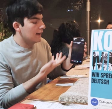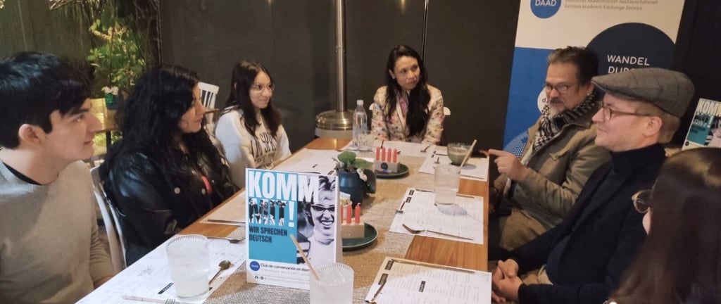 Su trato espontáneo y accesible hizo que la conversación fluyera sin esfuerzo. Poco a poco, los participantes comenzaron a hacerle preguntas directamente, sobre todo sobre cómo aprendió el idioma, qué lo motivó a seguir y de qué manera el alemán influyó en su camino académico y profesional. Danke Adrián por tan buena compañía!