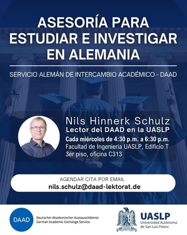 Ahora tienes la oportunidad de resolver todas tus dudas directamente con el Lector del DAAD México en la Universidad Autónoma de San Luis Potosí (UASLP), Nils Hinnerk Schulz, quien ofrece asesorías personalizadas y gratuitas todos en su oficina dentro de la Facultad de Ingeniería.
