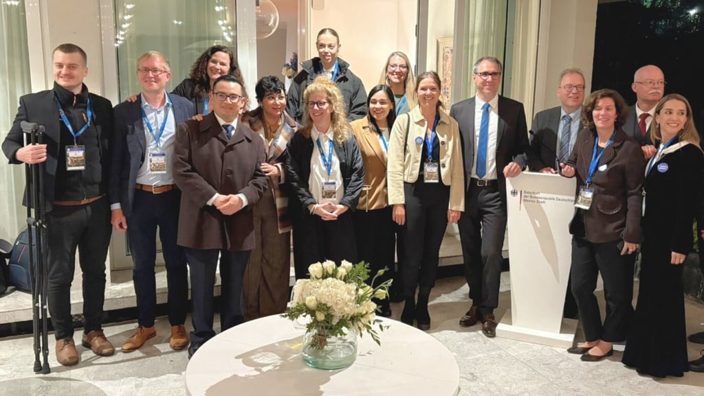Durante la celebración, el Dr. Kai Sicks reconoció a Nils Schulz y lo saludó cordialmente, recordando el encuentro que habían tenido meses atrás en la oficina central del DAAD en Bonn. En aquella ocasión, el Dr. Sicks le entregó a Nils un diploma de reconocimiento por su labor como Embajador del programa Dhoch3 y su contribución al Módulo 10 del proyecto.