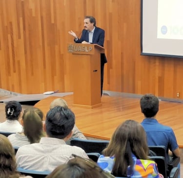 La conferencia inaugural fue un evento oficial cubierto por la prensa de la Universidad. Lee la nota periodística publicada en el sitio oficial de noticias de la UASLP: https://wp.uaslp.mx/noticias/academica/lector-del-daad-impulsa-cooperacion-academica-y-cultural-entre-alemania-y-la-uaslp/