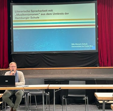 La propuesta de Nils se centró en el uso de la literatura —en particular, las novelas vinculadas al entorno de la Hamburger Schule— como herramienta para el trabajo lingüístico, combinando análisis literario, competencia lingüística y contexto cultural. De este modo, su contribución se integró plenamente en el enfoque del congreso, que promueve una enseñanza del alemán abierta, diversa y contextualizada.