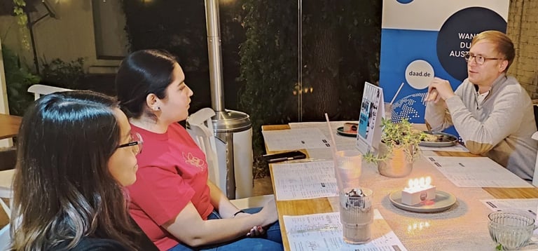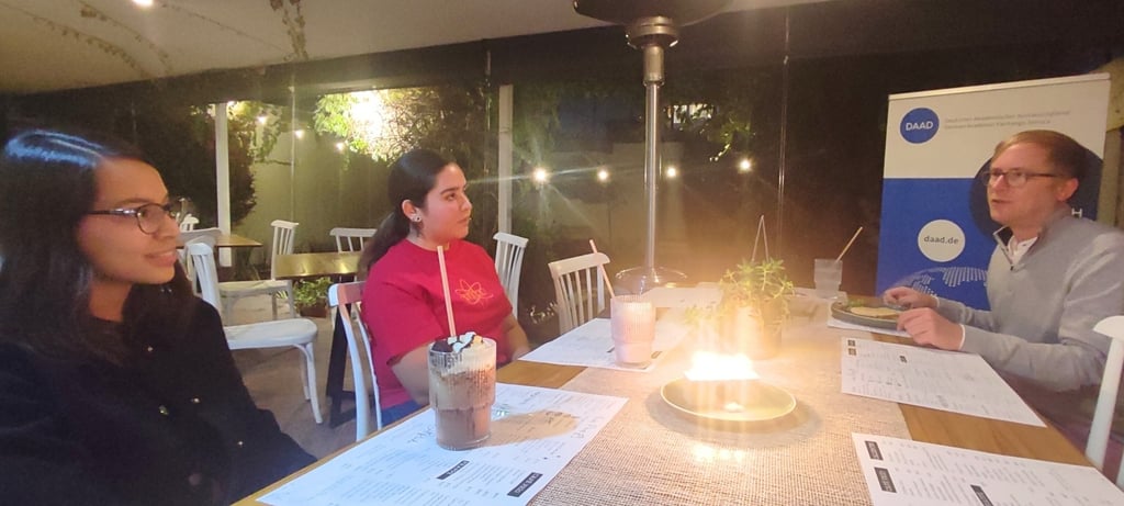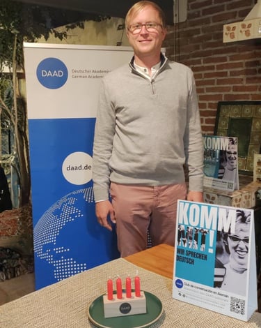 Para iniciar el diálogo, Nils Schulz llevó un Adventskerzen, un conjunto de velas de Adviento parte de las tradiciones navideñas alemanas, enviadas desde la sede principal del DAAD en Bonn. No era un adorno más: fue la excusa perfecta para explicar cómo se vive esta tradición de Adviento en Alemania durante diciembre.