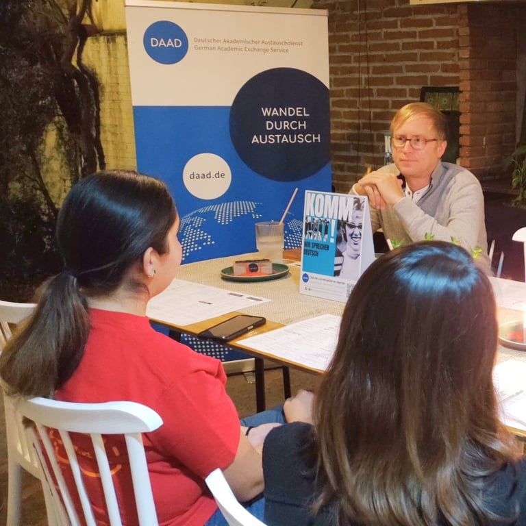 La segunda sesión del Club de conversación en Alemán en San Luis Potosí fue pequeña en número, pero enorme en oportunidad: dos participantes tuvieron una conversación directa con nuestro organizador Nils Schulz. Pero lejos de ser algo negativo, esto abrió una posibilidad que en grupos grandes es casi imposible: conversar directamente, sin prisa y sin presión, con un alemán que trabaja como Lector del DAAD en la UASLP.
